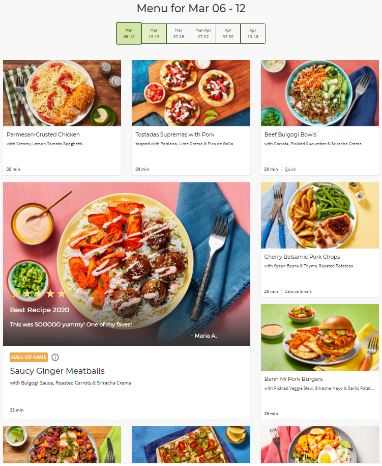 You can pick either two or four people for the plan, and between three and five meals per week. Each week, Hello Fresh has 20 delicious recipes on their menu for you to choose from. It's one of the top meal services with cheap meal plans.